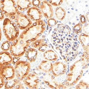 IHC检测PI 3 Kinase p55 gamma蛋白(货号 GB115763). 样品: 大鼠肾, 4%多聚甲醛 (货号G1101) 固定12-24小时. 抗原修复: 柠檬酸抗原修复液(干粉, pH 6.0) (G1201), 98℃, 20分钟. —抗: 1: 300稀释, 4℃ 孵育过夜. 二抗: S-vision免疫组化多聚二抗(山羊抗兔),即用型 (货号G1302), 室温孵育20分钟. |