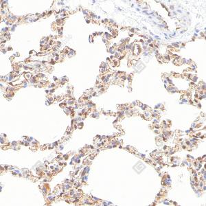 IHC检测PI 3 Kinase p55 gamma蛋白(货号 GB115763). 样品: 大鼠肺, 4%多聚甲醛 (货号G1101) 固定12-24小时. 抗原修复: 柠檬酸抗原修复液(干粉, pH 6.0) (G1201), 98℃, 20分钟. —抗: 1: 300稀释, 4℃ 孵育过夜. 二抗: S-vision免疫组化多聚二抗(山羊抗兔),即用型 (货号G1302), 室温孵育20分钟. |