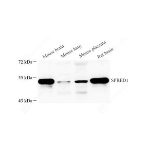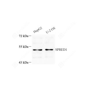 WB检测SPRED1蛋白(货号 GB113773). 样品: 经RIPA裂解液(货号G2002)处理的蛋白质. 封闭: 封闭: 3%脱脂牛奶(货号GC310001)溶于TBST溶液, 室温孵育1小时. —抗: 1: 1000稀释, 4℃ 孵育过夜. 二抗: HRP标记山羊抗兔IgG (H+L) (货号GB23303), 1: 5000稀释, 室温孵育1小时. |