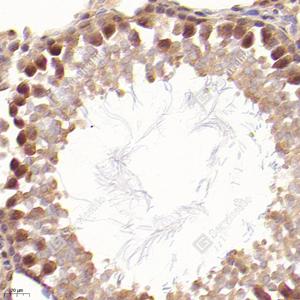 IHC检测DUSP26蛋白(货号 GB114557). 样品: 大鼠睾丸, 4%多聚甲醛 (货号G1101) 固定12-24小时. 抗原修复: 柠檬酸抗原修复液(干粉, pH 6.0) (G1201), 98℃, 20分钟. —抗: 1: 2700稀释, 4℃ 孵育过夜. 二抗: HRP标记山羊抗兔IgG (H+L) (货号GB23303), 1: 200稀释, 室温孵育1小时. |