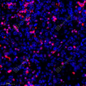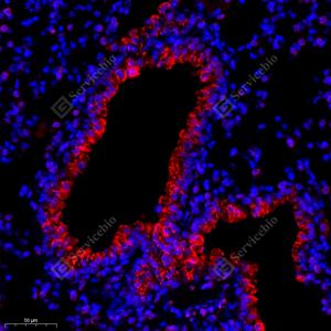 IF检测DUSP26蛋白(货号 GB114557)(红色). 样品: 小鼠肺, 4%多聚甲醛 (货号G1101) 固定12-24小时. 抗原修复: Tris-EDTA抗原修复液(pH 9.0) (G1203), 98℃, 20分钟. 封闭: 3% BSA(货号GC305010)的PBS溶液, 室温孵育30分钟. —抗: 1: 900稀释, 4℃ 孵育过夜. 二抗: Cy3标记山羊抗兔IgG (H+L) (货号GB21303), 1: 300稀释, 室温孵育1小时. |