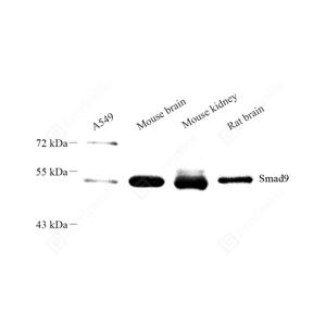 WB检测SMAD9蛋白(货号 GB113369). 样品: 经RIPA裂解液(货号G2002)处理的蛋白质. 封闭: 3%脱脂牛奶(货号GC310001)溶于TBST溶液, 室温孵育1小时. —抗: 1: 1000稀释, 4℃ 孵育过夜. 二抗: HRP标记山羊抗兔IgG (H+L) (货号GB23303), 1: 5000稀释, 室温孵育1小时. |