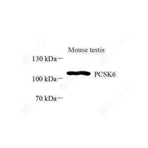 WB检测PACE4蛋白(货号 GB114876). 样品: 经RIPA裂解液(货号G2002)处理的蛋白质. 封闭: 封闭: 3%脱脂牛奶(货号GC310001)溶于TBST溶液, 室温孵育1小时. —抗: 1: 1500稀释, 4℃ 孵育过夜. 二抗: HRP标记山羊抗兔IgG (H+L) (货号GB23303), 1: 5000稀释, 室温孵育1小时. |