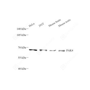 WB检测PAK4蛋白(货号 GB115491). 样品: 经RIPA裂解液(货号G2002)处理的蛋白质. 封闭: 封闭: 3%脱脂牛奶(货号GC310001)溶于TBST溶液, 室温孵育1小时. —抗: 1: 300稀释, 4℃ 孵育过夜. 二抗: HRP标记山羊抗兔IgG (H+L) (货号GB23303), 1: 5000稀释, 室温孵育1小时. |