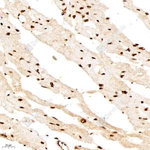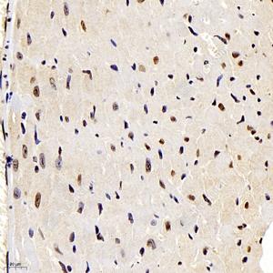 IHC检测SMAD6蛋白(货号 GB11654). 样品: 大鼠心, 4%多聚甲醛 (货号G1101) 固定12-24小时. 抗原修复: Tris-EDTA抗原修复液(pH 9.0) (G1203), 98℃, 20分钟. —抗: 1: 1000稀释, 4℃ 孵育过夜. 二抗: HRP标记山羊抗兔IgG (H+L) (货号GB23303), 1: 200稀释, 室温孵育1小时. |
