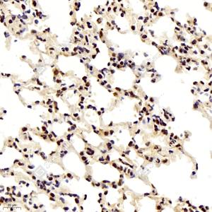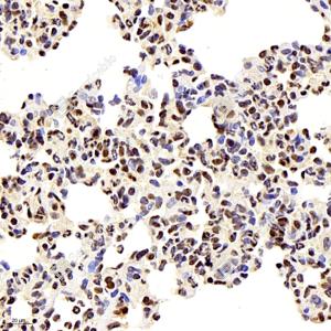 IHC检测SMAD6蛋白(货号 GB11654). 样品: 小鼠肺, 4%多聚甲醛 (货号G1101) 固定12-24小时. 抗原修复: Tris-EDTA抗原修复液(pH 9.0) (G1203), 98℃, 20分钟. —抗: 1: 1000稀释, 4℃ 孵育过夜. 二抗: HRP标记山羊抗兔IgG (H+L) (货号GB23303), 1: 200稀释, 室温孵育1小时. |