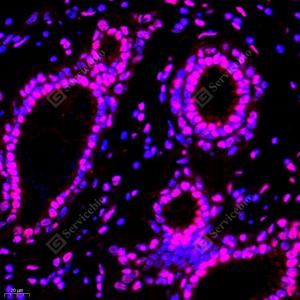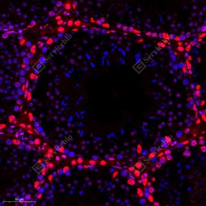 IF检测SMAD6蛋白(货号 GB11654)(红色). 样品: 小鼠睾丸, 4%多聚甲醛 (货号G1101) 固定12-24小时. 抗原修复: Tris-EDTA抗原修复液(pH 9.0) (G1203), 98℃, 20分钟. 封闭: 3% BSA(货号GC305010)的PBS溶液, 室温孵育30分钟. —抗: 1: 1000稀释, 4℃ 孵育过夜. 二抗: Cy3标记山羊抗兔IgG (H+L) (货号GB21303), 1: 300稀释, 室温孵育1小时. |