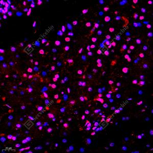 IF检测SMAD6蛋白(货号 GB11654)(红色). 样品: 人肝癌, 4%多聚甲醛 (货号G1101) 固定12-24小时. 抗原修复: Tris-EDTA抗原修复液(pH 9.0) (G1203), 98℃, 20分钟. 封闭: 3% BSA(货号GC305010)的PBS溶液, 室温孵育30分钟. —抗: 1: 1000稀释, 4℃ 孵育过夜. 二抗: Cy3标记山羊抗兔IgG (H+L) (货号GB21303), 1: 300稀释, 室温孵育1小时. |