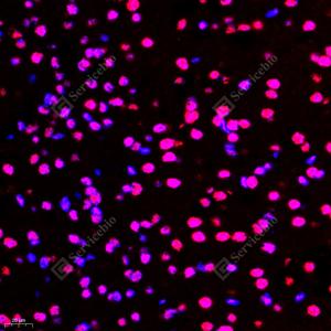 IF检测SMAD6蛋白(货号 GB11654)(红色). 样品: 小鼠脑, 4%多聚甲醛 (货号G1101) 固定12-24小时. 抗原修复: Tris-EDTA抗原修复液(pH 9.0) (G1203), 98℃, 20分钟. 封闭: 3% BSA(货号GC305010)的PBS溶液, 室温孵育30分钟. —抗: 1: 1000稀释, 4℃ 孵育过夜. 二抗: Cy3标记山羊抗兔IgG (H+L) (货号GB21303), 1: 300稀释, 室温孵育1小时. |