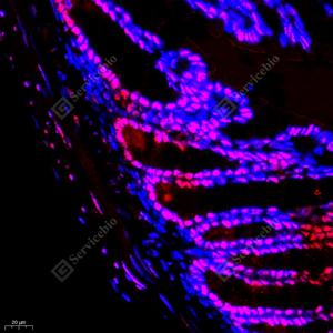 IF检测SMAD6蛋白(货号 GB11654)(红色). 样品: 小鼠结肠, 4%多聚甲醛 (货号G1101) 固定12-24小时. 抗原修复: Tris-EDTA抗原修复液(pH 9.0) (G1203), 98℃, 20分钟. 封闭: 3% BSA(货号GC305010)的PBS溶液, 室温孵育30分钟. —抗: 1: 1000稀释, 4℃ 孵育过夜. 二抗: Cy3标记山羊抗兔IgG (H+L) (货号GB21303), 1: 300稀释, 室温孵育1小时. |
