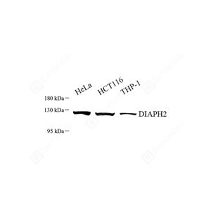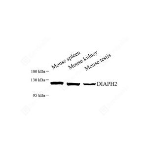 WB检测DIAPH2/DIA蛋白(货号 GB111871). 样品: 经RIPA裂解液(货号G2002)处理的蛋白质. 封闭: 封闭: 3%脱脂牛奶(货号GC310001)溶于TBST溶液, 室温孵育1小时. —抗: 1: 500稀释, 4℃ 孵育过夜. 二抗: HRP标记山羊抗兔IgG (H+L) (货号GB23303), 1: 5000稀释, 室温孵育1小时. |
