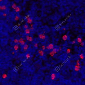 IF检测IBTK蛋白(货号 GB114533)(红色). 样品: 大鼠脾, 4%多聚甲醛 (货号G1101) 固定12-24小时. 抗原修复: Tris-EDTA抗原修复液(pH 9.0) (G1203), 98℃, 20分钟. 封闭: 3% BSA(货号GC305010)的PBS溶液, 室温孵育30分钟. —抗: 1: 800稀释, 4℃ 孵育过夜. 二抗: Cy3标记山羊抗兔IgG (H+L) (货号GB21303), 1: 300稀释, 室温孵育1小时. |