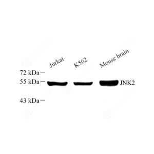 WB检测JNK3蛋白(货号 GB112329). 样品: 经RIPA裂解液(货号G2002)处理的蛋白质. 封闭: 封闭: 3%脱脂牛奶(货号GC310001)溶于TBST溶液, 室温孵育1小时. —抗: 1: 500稀释, 4℃ 孵育过夜. 二抗: HRP标记山羊抗兔IgG (H+L) (货号GB23303), 1: 5000稀释, 室温孵育1小时. |
