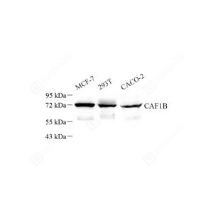 WB检测p60 CAF1/MPP7蛋白(货号 GB112460). 样品: 经RIPA裂解液(货号G2002)处理的蛋白质. 封闭: 封闭: 3%脱脂牛奶(货号GC310001)溶于TBST溶液, 室温孵育1小时. —抗: 1: 500稀释, 4℃ 孵育过夜. 二抗: HRP标记山羊抗兔IgG (H+L) (货号GB23303), 1: 5000稀释, 室温孵育1小时. |