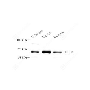 WB检测PDE1C/PDE1蛋白(货号 GB114930). 样品: 经RIPA裂解液(货号G2002)处理的蛋白质. 封闭: 3%脱脂牛奶(货号GC310001)溶于TBST溶液, 室温孵育1小时. —抗: 1: 3000稀释, 4℃ 孵育过夜. 二抗: HRP标记山羊抗兔IgG (H+L) (货号GB23303), 1: 5000稀释, 室温孵育1小时. |