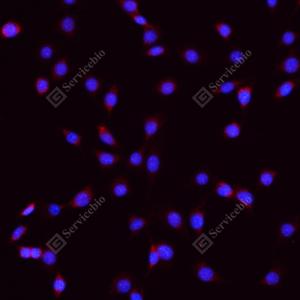 ICC检测PDE1C/PDE1蛋白(货号 GB114930)(红色). 样品: NIH-3T3细胞, 4%多聚甲醛 (货号G1101) 固定20分钟. 封闭: 3% BSA(货号GC305010)的PBS溶液, 室温孵育30分钟. 一抗: 1: 200稀释, 4℃ 孵育过夜. 二抗: Cy3标记山羊抗兔IgG (H+L) (货号GB21303), 1: 300稀释, 室温孵育1小时. |