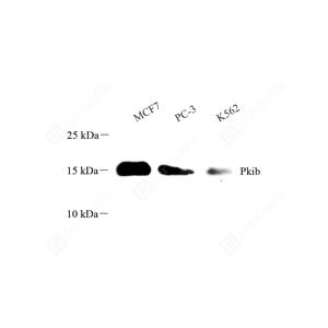 WB检测PKIB蛋白(货号 GB114570). 样品: 经RIPA裂解液(货号G2002)处理的蛋白质. 封闭: 封闭: 3%脱脂牛奶(货号GC310001)溶于TBST溶液, 室温孵育1小时. —抗: 1: 500稀释, 4℃ 孵育过夜. 二抗: HRP标记山羊抗兔IgG (H+L) (货号GB23303), 1: 5000稀释, 室温孵育1小时. |