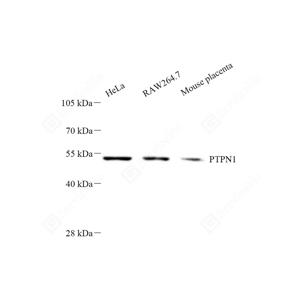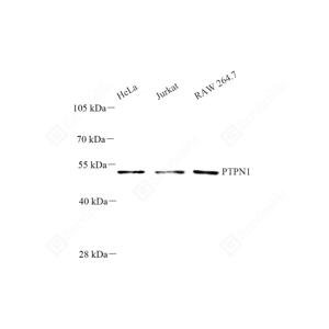 WB检测PTP1B蛋白(货号 GB115487). 样品: 经RIPA裂解液(货号G2002)处理的蛋白质. 封闭: 封闭: 3%脱脂牛奶(货号GC310001)溶于TBST溶液, 室温孵育1小时. —抗: 1: 300稀释, 4℃ 孵育过夜. 二抗: HRP标记山羊抗兔IgG (H+L) (货号GB23303), 1: 5000稀释, 室温孵育1小时. |