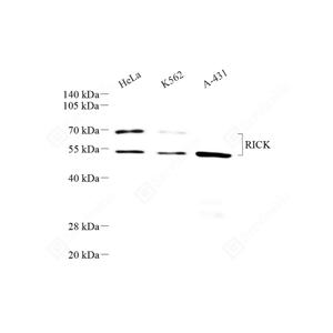 WB检测RIP2蛋白(货号 GB115502). 样品: 经RIPA裂解液(货号G2002)处理的蛋白质. 封闭: 封闭: 3%脱脂牛奶(货号GC310001)溶于TBST溶液, 室温孵育1小时. —抗: 1: 300稀释, 4℃ 孵育过夜. 二抗: HRP标记山羊抗兔IgG (H+L) (货号GB23303), 1: 5000稀释, 室温孵育1小时. |