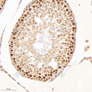 IHC检测RPS6KL1蛋白(货号 GB114801). 样品: 大鼠睾丸, 4%多聚甲醛 (货号G1101) 固定12-24小时. 抗原修复: 柠檬酸抗原修复液(干粉, pH 6.0) (G1201), 98℃, 20分钟. —抗: 1: 1000稀释, 4℃ 孵育过夜. 二抗: HRP标记山羊抗兔IgG (H+L) (货号GB23303), 1: 200稀释, 室温孵育1小时. |
