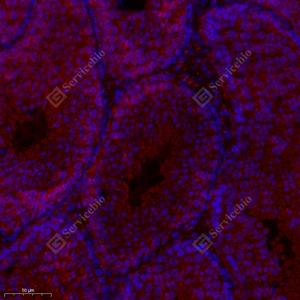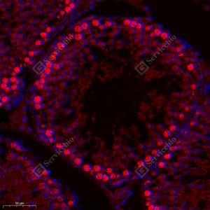 IF检测RPS6KL1蛋白(货号 GB114801)(红色). 样品: 小鼠睾丸, 4%多聚甲醛 (货号G1101) 固定12-24小时. 抗原修复: Tris-EDTA抗原修复液(pH 9.0) (G1203), 98℃, 20分钟. 封闭: 3% BSA(货号GC305010)的PBS溶液, 室温孵育30分钟. —抗: 1: 300稀释, 4℃ 孵育过夜. 二抗: Cy3标记山羊抗兔IgG (H+L) (货号GB21303), 1: 300稀释, 室温孵育1小时. |