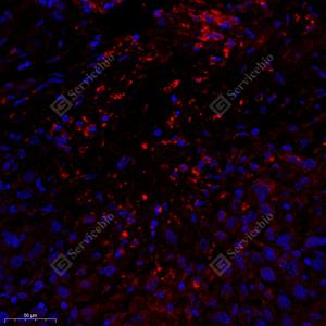 IF检测RPS6KL1蛋白(货号 GB114801)(红色). 样品: 人肺癌, 4%多聚甲醛 (货号G1101) 固定12-24小时. 抗原修复: Tris-EDTA抗原修复液(pH 9.0) (G1203), 98℃, 20分钟. 封闭: 3% BSA(货号GC305010)的PBS溶液, 室温孵育30分钟. —抗: 1: 300稀释, 4℃ 孵育过夜. 二抗: Cy3标记山羊抗兔IgG (H+L) (货号GB21303), 1: 300稀释, 室温孵育1小时. |