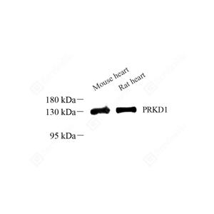 WB检测PKC mu/PKD蛋白(货号 GB113328). 样品: 经RIPA裂解液(货号G2002)处理的蛋白质. 封闭: 封闭: 3%脱脂牛奶(货号GC310001)溶于TBST溶液, 室温孵育1小时. —抗: 1: 600稀释, 4℃ 孵育过夜. 二抗: HRP标记山羊抗兔IgG (H+L) (货号GB23303), 1: 5000稀释, 室温孵育1小时. |
