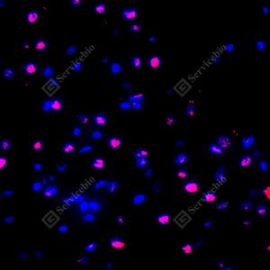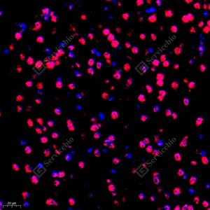 IF检测VPS72蛋白(货号 GB111468)(红色). 样品: 小鼠脑, 4%多聚甲醛 (货号G1101) 固定12-24小时. 抗原修复: Tris-EDTA抗原修复液(pH 9.0) (G1203), 98℃, 20分钟. 封闭: 3% BSA(货号GC305010)的PBS溶液, 室温孵育30分钟. —抗: 1: 250稀释, 4℃ 孵育过夜. 二抗: Cy3标记山羊抗兔IgG (H+L) (货号GB21303), 1: 300稀释, 室温孵育1小时. |