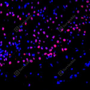 IF检测ZBTB40蛋白(货号 GB111516)(红色). 样品: 小鼠脑, 4%多聚甲醛 (货号G1101) 固定12-24小时. 抗原修复: Tris-EDTA抗原修复液(pH 9.0) (G1203), 98℃, 20分钟. 封闭: 3% BSA(货号GC305010)的PBS溶液, 室温孵育30分钟. —抗: 1: 400稀释, 4℃ 孵育过夜. 二抗: Cy3标记山羊抗兔IgG (H+L) (货号GB21303), 1: 300稀释, 室温孵育1小时. |