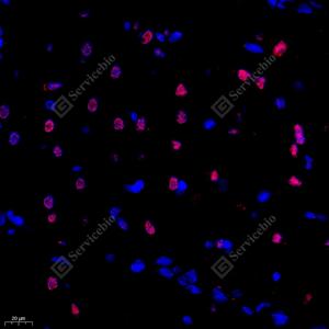 | IF检测ZNF154蛋白(货号 GB112770)(红色). 样品: 大鼠海马区, 4%多聚甲醛 (货号G1101) 固定12-24小时. 抗原修复: Tris-EDTA抗原修复液(pH 9.0) (G1203), 98℃, 20分钟. 封闭: 3% BSA(货号GC305010)的PBS溶液, 室温孵育30分钟. —抗: 1: 700稀释, 4℃ 孵育过夜. 二抗: Cy3标记山羊抗兔IgG (H+L) (货号GB21303), 1: 300稀释, 室温孵育1小时. |
