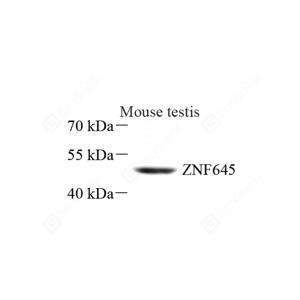 WB检测ZNF645蛋白(货号 GB115323). 样品: 经RIPA裂解液(货号G2002)处理的蛋白质. 封闭: 封闭: 3%脱脂牛奶(货号GC310001)溶于TBST溶液, 室温孵育1小时. —抗: 1: 1000稀释, 4℃ 孵育过夜. 二抗: HRP标记山羊抗兔IgG (H+L) (货号GB23303), 1: 5000稀释, 室温孵育1小时. |