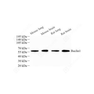 WB检测Beclin 1蛋白(货号 GB120013). 样品: 经RIPA裂解液(货号G2002)处理的蛋白质. 封闭: 3%脱脂牛奶(货号GC310001)溶于TBST溶液, 室温孵育1小时. —抗: 1: 1000稀释, 4℃ 孵育过夜. 二抗: HRP标记山羊抗小鼠IgG (H+L) (货号GB23301), 1: 5000稀释, 室温孵育1小时. |