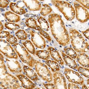 IHC检测APG5L/ATG5蛋白(货号 GB11401). 样品: 人肾, 4%多聚甲醛 (货号G1101) 固定12-24小时. 抗原修复: 柠檬酸抗原修复液(干粉, pH 6.0) (G1201), 98℃, 20分钟. —抗: 1: 800稀释, 4℃ 孵育过夜. 二抗: HRP标记山羊抗兔IgG (H+L) (货号GB23303), 1: 200稀释, 室温孵育1小时. |