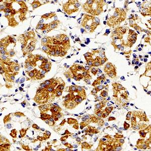 IHC检测APG5L/ATG5蛋白(货号 GB11401). 样品: 人胃, 4%多聚甲醛 (货号G1101) 固定12-24小时. 抗原修复: 柠檬酸抗原修复液(干粉, pH 6.0) (G1201), 98℃, 20分钟. —抗: 1: 1000稀释, 4℃ 孵育过夜. 二抗: HRP标记山羊抗兔IgG (H+L) (货号GB23303), 1: 200稀释, 室温孵育1小时. |