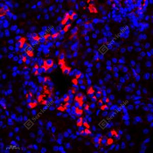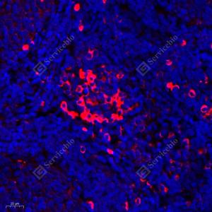 IF检测APG5L/ATG5蛋白(货号 GB11401)(红色). 样品: 大鼠淋巴结, 4%多聚甲醛 (货号G1101) 固定12-24小时. 抗原修复: Tris-EDTA抗原修复液(pH 9.0) (G1203), 98℃, 20分钟. 封闭: 3% BSA(货号GC305010)的PBS溶液, 室温孵育30分钟. —抗: 1: 500稀释, 4℃ 孵育过夜. 二抗: Cy3标记山羊抗兔IgG (H+L) (货号GB21303), 1: 300稀释, 室温孵育1小时. |