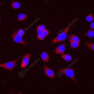 | ICC检测ATG7蛋白(货号 GB15399)(红色). 样品: NIH3T3细胞, 4%多聚甲醛 (货号G1101) 固定20分钟. 封闭: 3% BSA(货号GC305010)的PBS溶液, 室温孵育30分钟. —抗: 1: 200稀释, 4℃ 孵育过夜. 二抗: Cy3标记山羊抗兔IgG (H+L) (货号GB21303), 1: 300稀释, 室温孵育1小时. |