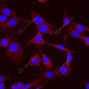 | ICC检测ATG7蛋白(货号 GB15399)(红色). 样品: HT29细胞, 4%多聚甲醛 (货号G1101) 固定20分钟. 封闭: 3% BSA(货号GC305010)的PBS溶液, 室温孵育30分钟. —抗: 1: 200稀释, 4℃ 孵育过夜. 二抗: Cy3标记山羊抗兔IgG (H+L) (货号GB21303), 1: 300稀释, 室温孵育1小时. |
