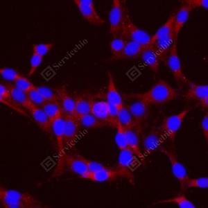| ICC检测ATG7蛋白(货号 GB15399)(红色). 样品: PC12细胞, 4%多聚甲醛 (货号G1101) 固定20分钟. 封闭: 3% BSA(货号GC305010)的PBS溶液, 室温孵育30分钟. —抗: 1: 200稀释, 4℃ 孵育过夜. 二抗: Cy3标记山羊抗兔IgG (H+L) (货号GB21303), 1: 300稀释, 室温孵育1小时. |