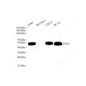 WB检测APG5L/ATG5蛋白(货号 GB15401). 样品: 经RIPA裂解液(货号G2002)处理的蛋白质. 封闭: 3%脱脂牛奶(货号GC310001)溶于TBST溶液, 室温孵育1小时. —抗: 1: 500稀释, 4℃ 孵育过夜. 二抗: HRP标记山羊抗兔IgG (H+L) (货号GB23303), 1: 5000稀释, 室温孵育1小时. |