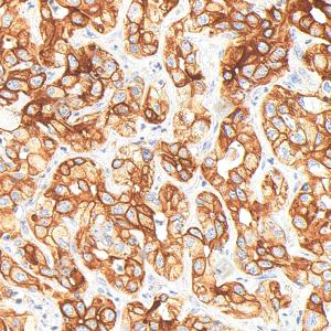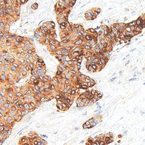 IHC检测APG5L/ATG5蛋白(货号 GB15401). 样品: 人乳腺癌, 4%多聚甲醛 (货号G1101) 固定12-24小时. 抗原修复: Tris-EDTA抗原修复液(pH 9.0) (G1203), 98℃, 20分钟. —抗: 1: 1000稀释, 4℃ 孵育过夜. 二抗: S-vision免疫组化多聚二抗(山羊抗兔),即用型 (货号G1302), 室温孵育20分钟. |