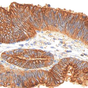 IHC检测APG5L/ATG5蛋白(货号 GB15401). 样品: 人结肠癌, 4%多聚甲醛 (货号G1101) 固定12-24小时. 抗原修复: Tris-EDTA抗原修复液(pH 9.0) (G1203), 98℃, 20分钟. —抗: 1: 1000稀释, 4℃ 孵育过夜. 二抗: S-vision免疫组化多聚二抗(山羊抗兔),即用型 (货号G1302), 室温孵育20分钟. |