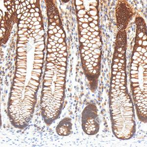 IHC检测APG5L/ATG5蛋白(货号 GB15401). 样品: 人结肠, 4%多聚甲醛 (货号G1101) 固定12-24小时. 抗原修复: Tris-EDTA抗原修复液(pH 9.0) (G1203), 98℃, 20分钟. —抗: 1: 1000稀释, 4℃ 孵育过夜. 二抗: S-vision免疫组化多聚二抗(山羊抗兔),即用型 (货号G1302), 室温孵育20分钟. |