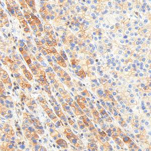 IHC检测APG5L/ATG5蛋白(货号 GB15401). 样品: 人肝癌, 4%多聚甲醛 (货号G1101) 固定12-24小时. 抗原修复: Tris-EDTA抗原修复液(pH 9.0) (G1203), 98℃, 20分钟. —抗: 1: 1000稀释, 4℃ 孵育过夜. 二抗: S-vision免疫组化多聚二抗(山羊抗兔),即用型 (货号G1302), 室温孵育20分钟. |