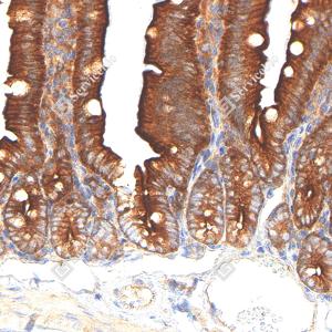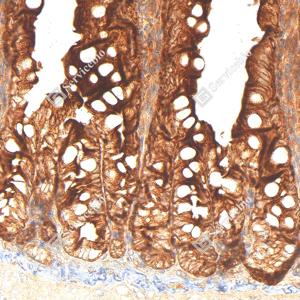 IHC检测APG5L/ATG5蛋白(货号 GB15401). 样品: 大鼠小肠, 4%多聚甲醛 (货号G1101) 固定12-24小时. 抗原修复: Tris-EDTA抗原修复液(pH 9.0) (G1203), 98℃, 20分钟. —抗: 1: 1000稀释, 4℃ 孵育过夜. 二抗: S-vision免疫组化多聚二抗(山羊抗兔),即用型 (货号G1302), 室温孵育20分钟. |