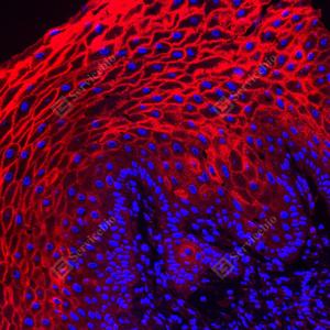 IF检测APG5L/ATG5蛋白(货号 GB15401)(红色). 样品: 人食管癌, 4%多聚甲醛 (货号G1101) 固定12-24小时. 抗原修复: Tris-EDTA抗原修复液(pH 9.0) (G1203), 98℃, 20分钟. 封闭: 3% BSA(货号GC305010)的PBS溶液, 室温孵育30分钟. —抗: 1: 1000稀释, 4℃ 孵育过夜. 二抗: Cy3标记山羊抗兔IgG (H+L) (货号GB21303), 1: 300稀释, 室温孵育1小时. |