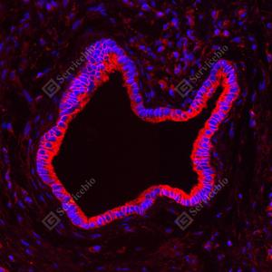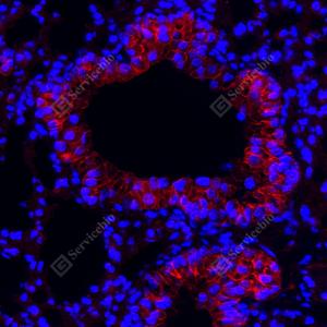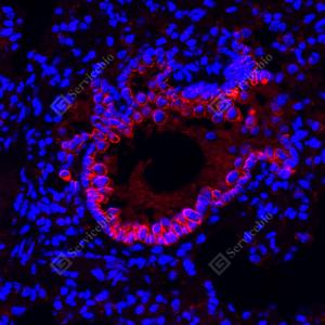 IF检测APG5L/ATG5蛋白(货号 GB15401)(红色). 样品: 小鼠肺, 4%多聚甲醛 (货号G1101) 固定12-24小时. 抗原修复: Tris-EDTA抗原修复液(pH 9.0) (G1203), 98℃, 20分钟. 封闭: 3% BSA(货号GC305010)的PBS溶液, 室温孵育30分钟. —抗: 1: 1000稀释, 4℃ 孵育过夜. 二抗: Cy3标记山羊抗兔IgG (H+L) (货号GB21303), 1: 300稀释, 室温孵育1小时. |