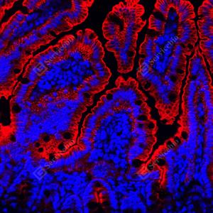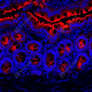 IF检测APG5L/ATG5蛋白(货号 GB15401)(红色). 样品: 小鼠小肠, 4%多聚甲醛 (货号G1101) 固定12-24小时. 抗原修复: Tris-EDTA抗原修复液(pH 9.0) (G1203), 98℃, 20分钟. 封闭: 3% BSA(货号GC305010)的PBS溶液, 室温孵育30分钟. —抗: 1: 1000稀释, 4℃ 孵育过夜. 二抗: Cy3标记山羊抗兔IgG (H+L) (货号GB21303), 1: 300稀释, 室温孵育1小时. |