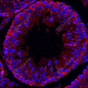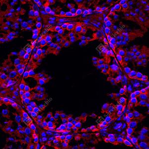 IF检测APG5L/ATG5蛋白(货号 GB15401)(红色). 样品: 大鼠睾丸, 4%多聚甲醛 (货号G1101) 固定12-24小时. 抗原修复: Tris-EDTA抗原修复液(pH 9.0) (G1203), 98℃, 20分钟. 封闭: 3% BSA(货号GC305010)的PBS溶液, 室温孵育30分钟. —抗: 1: 1000稀释, 4℃ 孵育过夜. 二抗: Cy3标记山羊抗兔IgG (H+L) (货号GB21303), 1: 300稀释, 室温孵育1小时. |