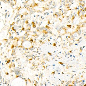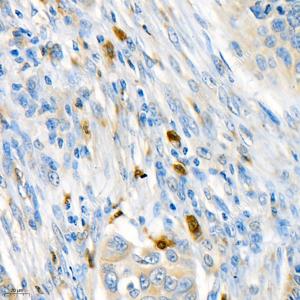 IHC检测NBR1蛋白(货号 GB11788). 样品: 人胃癌, 4%多聚甲醛 (货号G1101) 固定12-24小时. 抗原修复: 柠檬酸抗原修复液(干粉, pH 6.0) (G1201), 98℃, 20分钟. —抗: 1: 2000稀释, 4℃ 孵育过夜. 二抗: HRP标记山羊抗兔IgG (H+L) (货号GB23303), 1: 200稀释, 室温孵育1小时. |