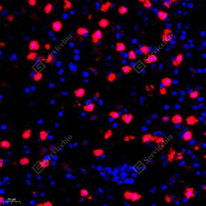IF检测NBR1蛋白(货号 GB11788)(红色). 样品: 人胃癌, 4%多聚甲醛 (货号G1101) 固定12-24小时. 抗原修复: Tris-EDTA抗原修复液(pH 9.0) (G1203), 98℃, 20分钟. 封闭: 3% BSA(货号GC305010)的PBS溶液, 室温孵育30分钟. —抗: 1: 500稀释, 4℃ 孵育过夜. 二抗: Cy3标记山羊抗兔IgG (H+L) (货号GB21303), 1: 300稀释, 室温孵育1小时. |